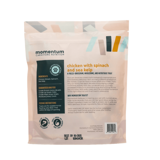 Enhance your pet’s meals with the Momentum Carnivore Nutrition Freeze-Dried Chicken, Spinach & Sea Kelp Topper. This nutrient-packed treat and topper combines the lean protein of chicken with the superfoods spinach and sea kelp, providing a wholesome, flavorful boost to your dog or cat’s diet.