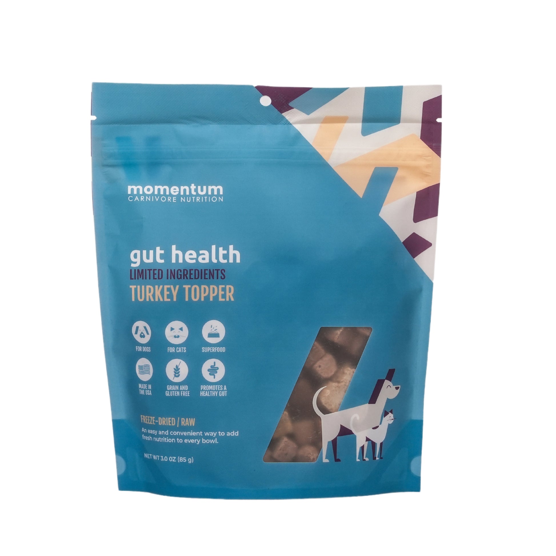 Keep your dog or cat’s tummy happy and balanced with the Momentum Carnivore Nutrition Freeze-Dried Raw Gut Health Topper. This pet food topper is made with all-natural ingredients and essential nutrients that support good digestion and gut health in pets, including: